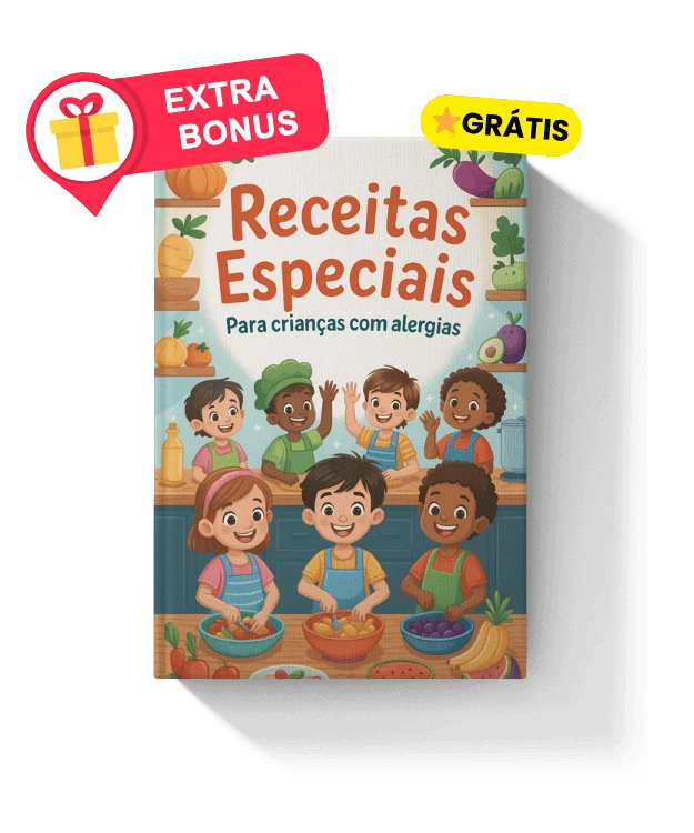 Sim. Além das receitas padrão, você recebe um bônus só com receitas adaptadas para alergias comuns (leite, ovo, soja, amendoim), com alternativas seguras e gostosas.